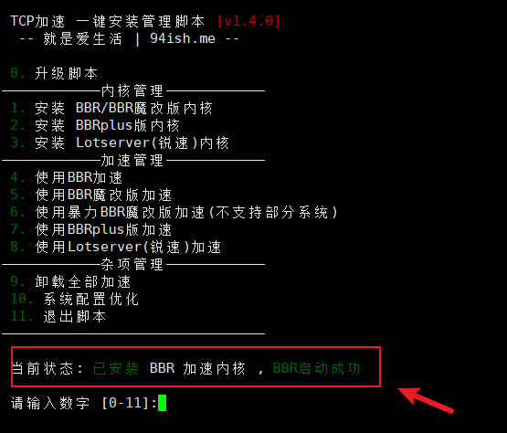 如果服务器系统是 CentOS,先输入 数字 1 安装内核,然后 重启服务器 后,输入 数字 4 启动 BBR 原版加速。